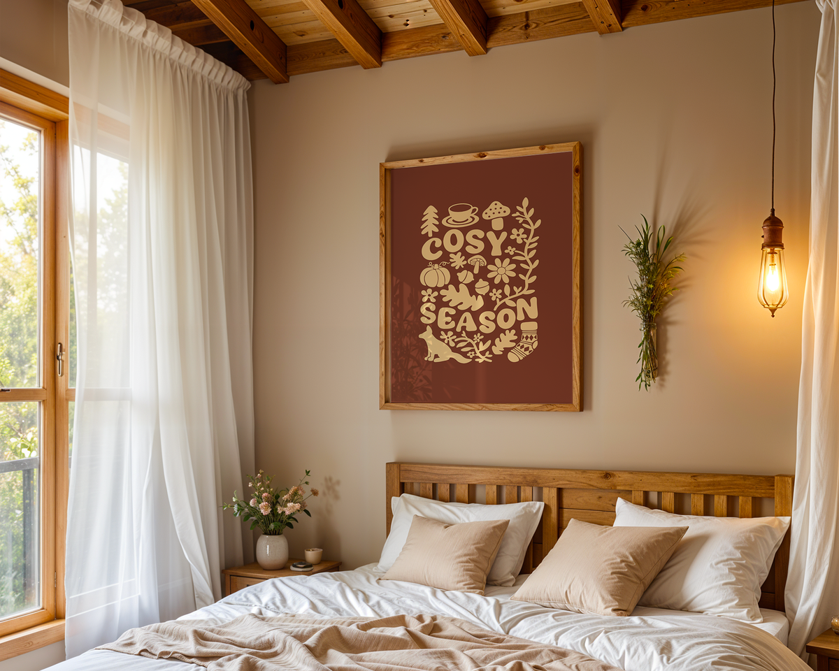 Das Poster „Cosy Season“ feiert die gemütlichste Zeit des Jahres und lädt dazu ein, den Alltag bewusst zu entschleunigen. Die handgezeichnete Illustration vereint liebevoll gestaltete Herbst- und Wintermotive wie warme Getränke, Pilze, Blätter, Socken und kleine Naturdetails zu einer harmonischen Komposition. Die warmen Farbtöne und die verspielte Typografie schaffen eine behagliche Atmosphäre, die sofort Geborgenheit ausstrahlt. Gestaltet wurde das Design von unserer Artistin Chloe, deren Stil Wärme, Naturverbundenheit und sanften Minimalismus auf besondere Weise miteinander vereint. Ein ideales Poster für alle, die hyggelige Momente, ruhige Tage und das Gefühl von Zuhause lieben.