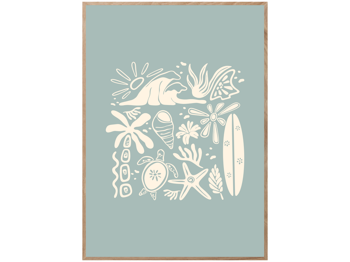 The "Beachy Vibes" poster captures the essence of summer, sea, and freedom in a harmonious composition. Delicate cream illustrations against a calming sea green background feature symbols such as waves, shells, coral, flowers, a surfboard, a starfish, and a turtle – a playful collage that instantly evokes vacation feelings. The organic lines and hand-drawn design lend the motif lightness and naturalness. An ideal wall decoration for anyone longing for a beach atmosphere and relaxed coastal flair – whether in the living room, bedroom, or vacation home.