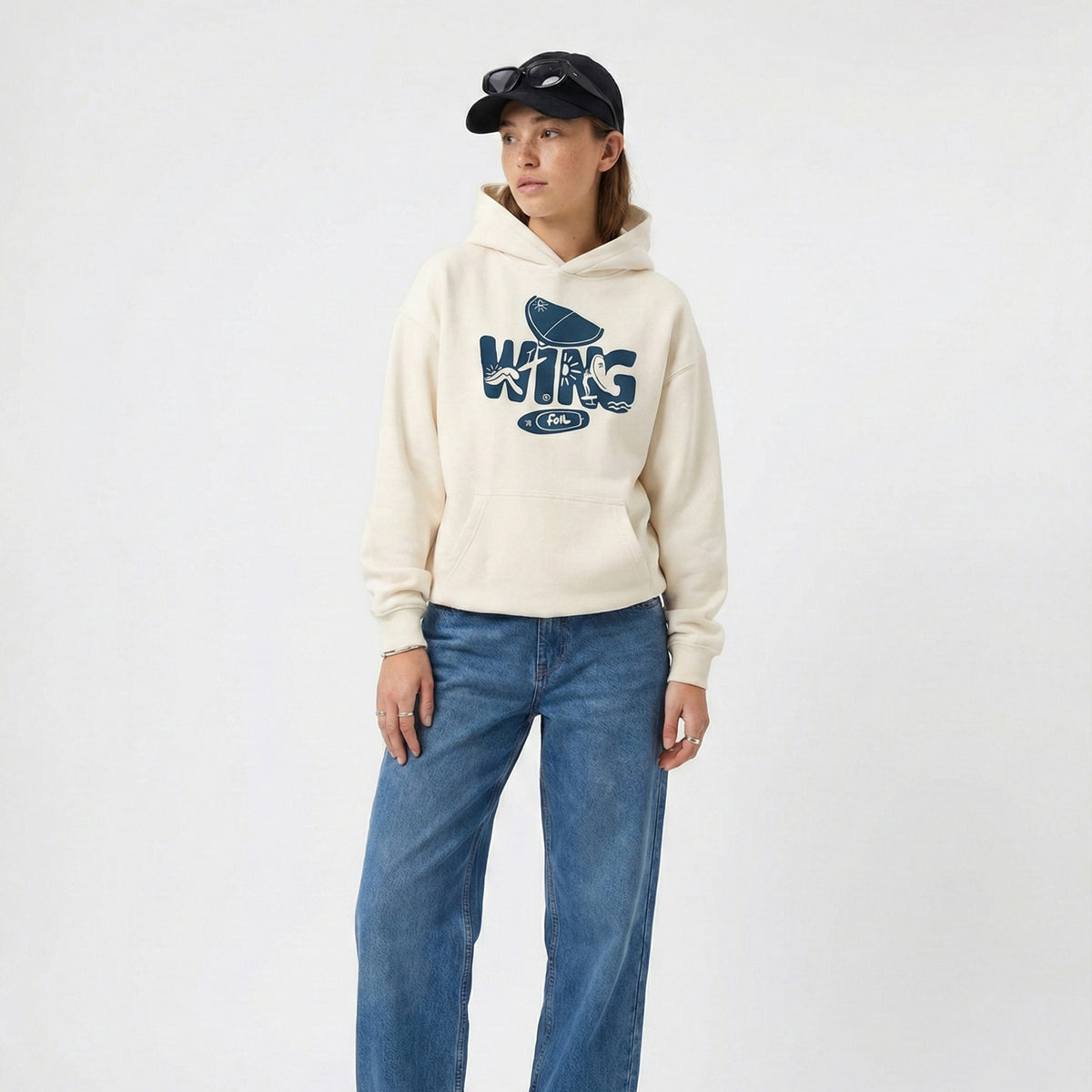 Leicht, kraftvoll und vom Wind getragen: Unser Heavy Cotton Hoodie im angesagten Oversized Fit bringt den Spirit des Wingfoilens in einen klaren, modernen Look. Der markante Frontprint „Wing Foil“ mit grafischen Elementen steht für Freiheit, Balance und die Faszination von Wind und Wasser – reduziert im Design, stark im Ausdruck.